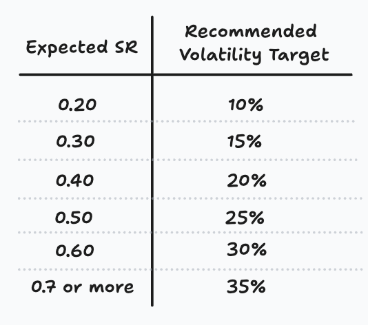 While everyone has a different risk appetite, we can still infer a recommended range of volatility targets. The only thing you need is your expected Sharpe Ratio (SR). Knowing your SR is no small feat, however—even with a solid backtest over many years, the SR remains a random variable following an unknown distribution. It can be positive on average, but inevitably some years will be negative. So I urge you to be conservative when selecting your expected Sharpe Ratio. Anything above 0.70 is too optimistic; yes, you can achieve a Sharpe >1.0 for years, but you are not immune to volatility, mean reversion, or the gravitational pull of a drawdown.