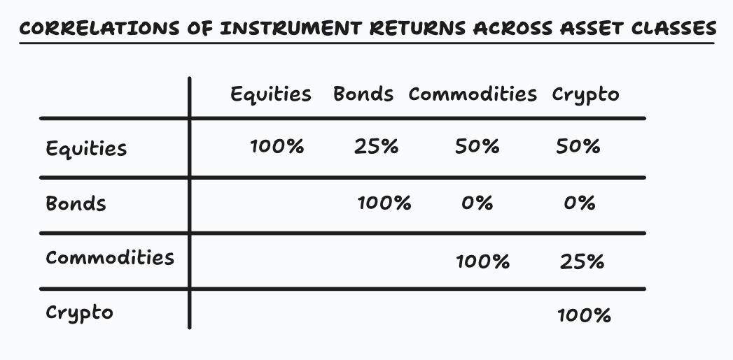 My solution is to avoid assuming correlation stability and to recognize that recent historical correlations are often poor predictors of future ones. Instead, I use conservative correlation assumptions and I aim for an average correlation target across my bets. The below table should be used as a rule of thumb for estimating correlation across bets using their instrument asset class. It doesn’t require any calculation and provide a good enough framework for achieving most of the diversification benefits.