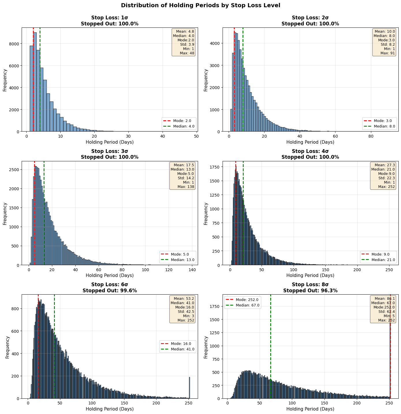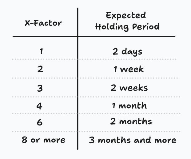 From the chart above, we can map an expected holding period to each X-factor stop loss level: