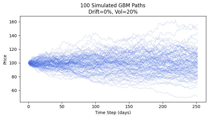 We can use geometric Brownian motion to simulate theoretical asset price paths. Below is an example of 100 simulated paths: