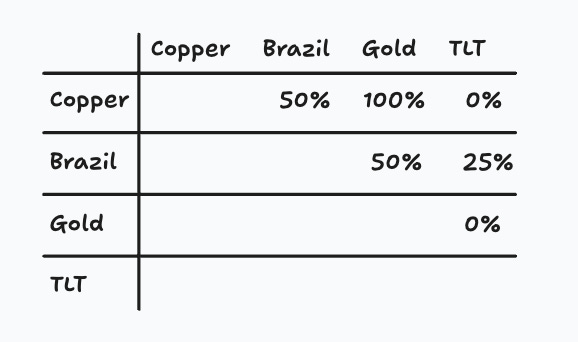 Using the recommended correlations by asset class, we can construct the following correlation matrix for Jane’s bets, yielding an average correlation of 37.5% ((50% + 100% + 0% + 50% + 25% + 0%) / 6).