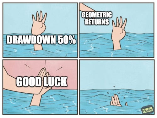 And the above figures are just based on daily normal uncorrelated returns. Introduce some autocorrelation between the returns—or what we call strong momentum—and you see where this can go: either a glorious run for the portfolio or a catastrophic rout sending it into a very deep drawdown. Big drawdowns are what kill returns: after losing 50%, you need a 100% return to break even. Good luck with that.