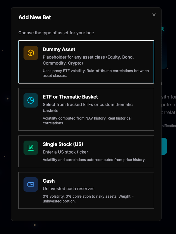 The Dummy Asset option allows you to add a bet on a theoretical asset, where you can manually set the asset class and volatility. By adding four dummy bets, we can recreate Jane’s portfolio as computed in the previous section: