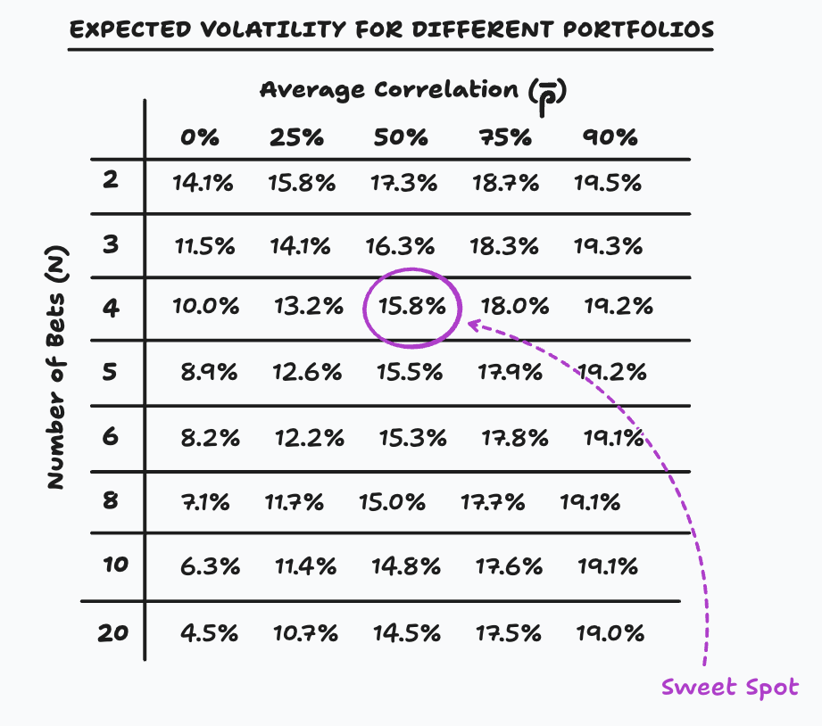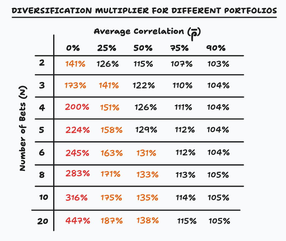 Unsurprisingly, adding more bets when correlation is high (90%) does not provide any benefits. It keeps the portfolio volatility very close to 20% and adds significant systematic risk—this is diworsification. However, adding more uncorrelated bets lower the overall portfolio volatility, and of course, the lower the correlation, the greater the diversification benefits. In reality, it is quite difficult to find many purely uncorrelated bets, and you will eventually stumble upon only 3 to 5 purely uncorrelated bets when trading or investing in traditional publicly listed assets. My sweet spot, and what I try to average over time, is to find 4 to 5 bets while aiming for an average correlation of 50%. This gives me enough diversification benefits while keeping the number of bets manageable. That’s my interpretation of Stanley Druckenmiller’s adage: “Put all your eggs in one basket and then watch that basket very carefully.”