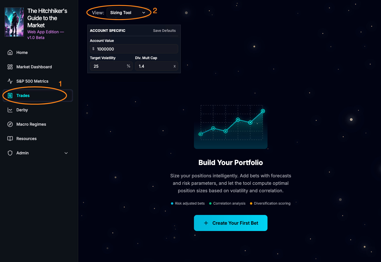 You will find the sizing tool on the Trades page, nested within the Sizing Tool view.