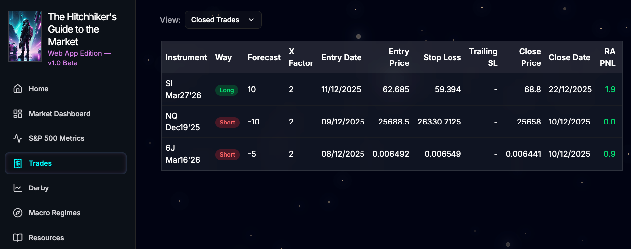 To apply this framework, consider subscribing to The Hitchhiker’s Guide to the Market. The free tier offers regular updates, while paid subscribers gain full access to the web app at https://app.markethitchhiker.com/, including tools for position sizing, thematic baskets, and other trading features. Paid members also get access to my open trades, which apply the Forecast and X-factor system described here, giving you the key inputs to size them intelligently in your own portfolio.