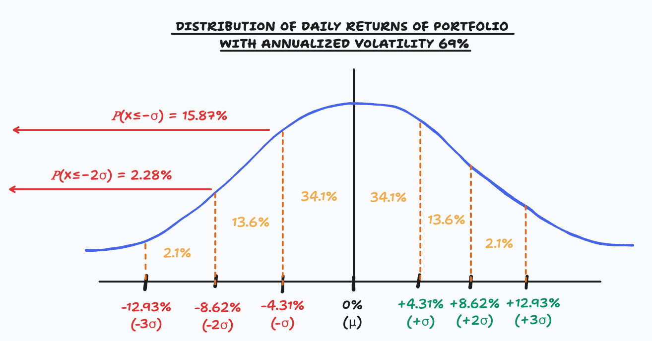 To put things in perspective, because volatility scales with the square root of time, 69% annual volatility means that on average your portfolio will move by +/-4.31% per day (69% / √252). You should expect that 3.33 days in a month your portfolio will be down by more than -4.31%, and 5 days a year it will be down by more than -8.62%.