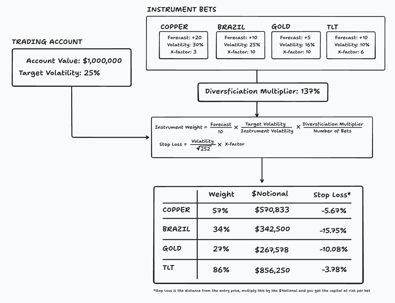 This sizing system may feel counterintuitive at first, as traditional approaches treat capital at risk per trade as a fixed input. Here, however, it emerges as an output derived from three key elements: your desired annual portfolio volatility, the confidence level (forecast) in each trade, and the normalized stop-loss distance (X-factor) tied to expected holding periods.