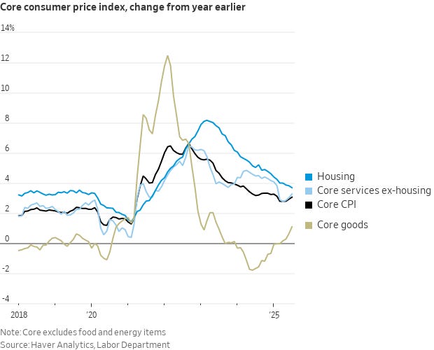 Core goods inflation has been trending upward due to tariffs, but it may not become a concern until later, as the market currently shows little worry. Other deflationary forces remain too dominant.