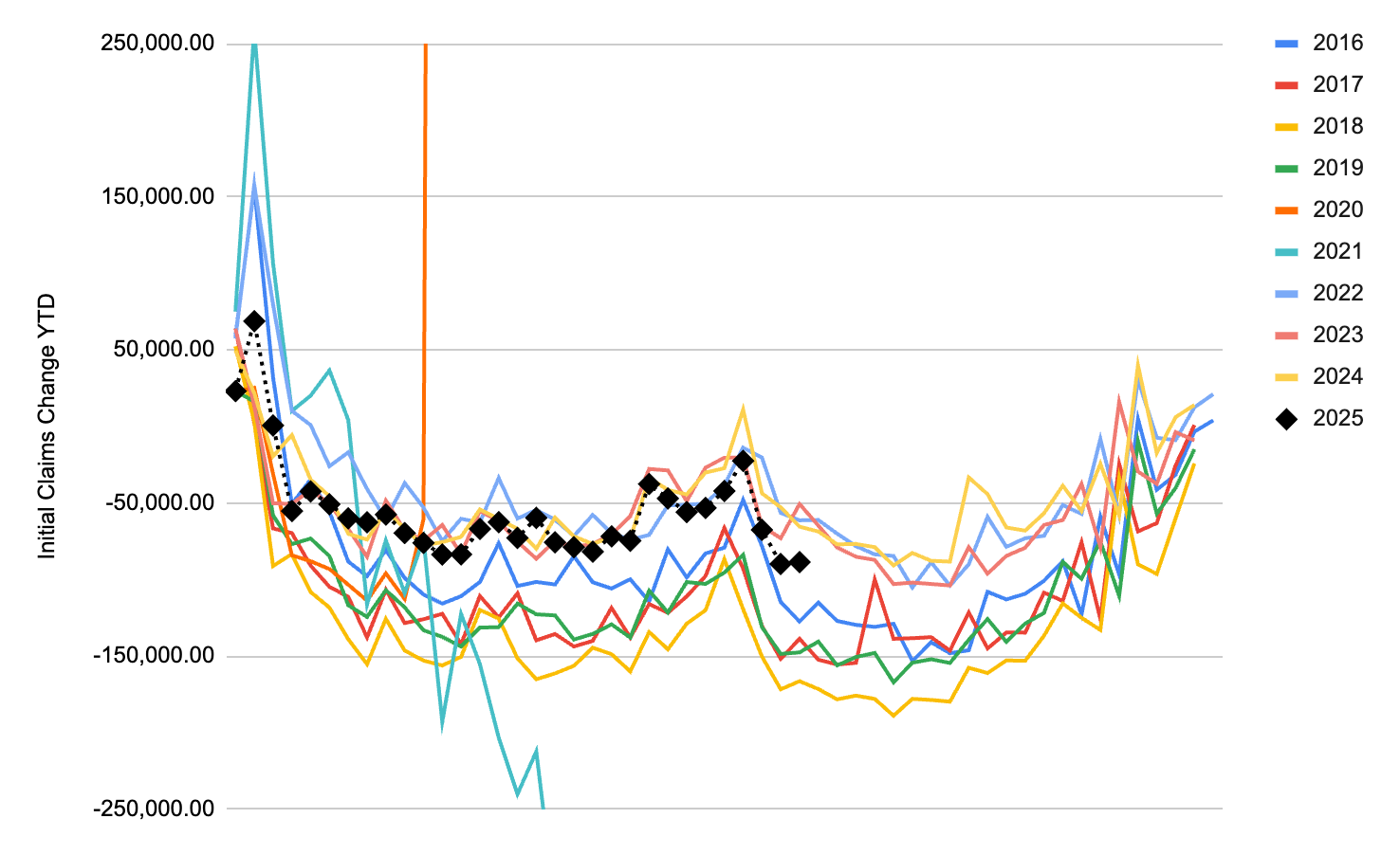 Initial Claims: They are now tracking lower than last year, indicating minimal layoffs in this economy. However, hiring remains stagnant, as evidenced by persistently high continuing claims and the elevated unemployment rate for new entrants. An awkward market.