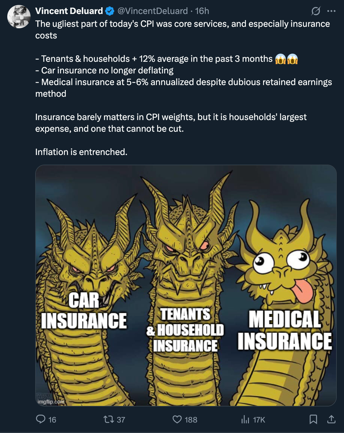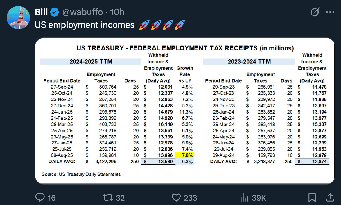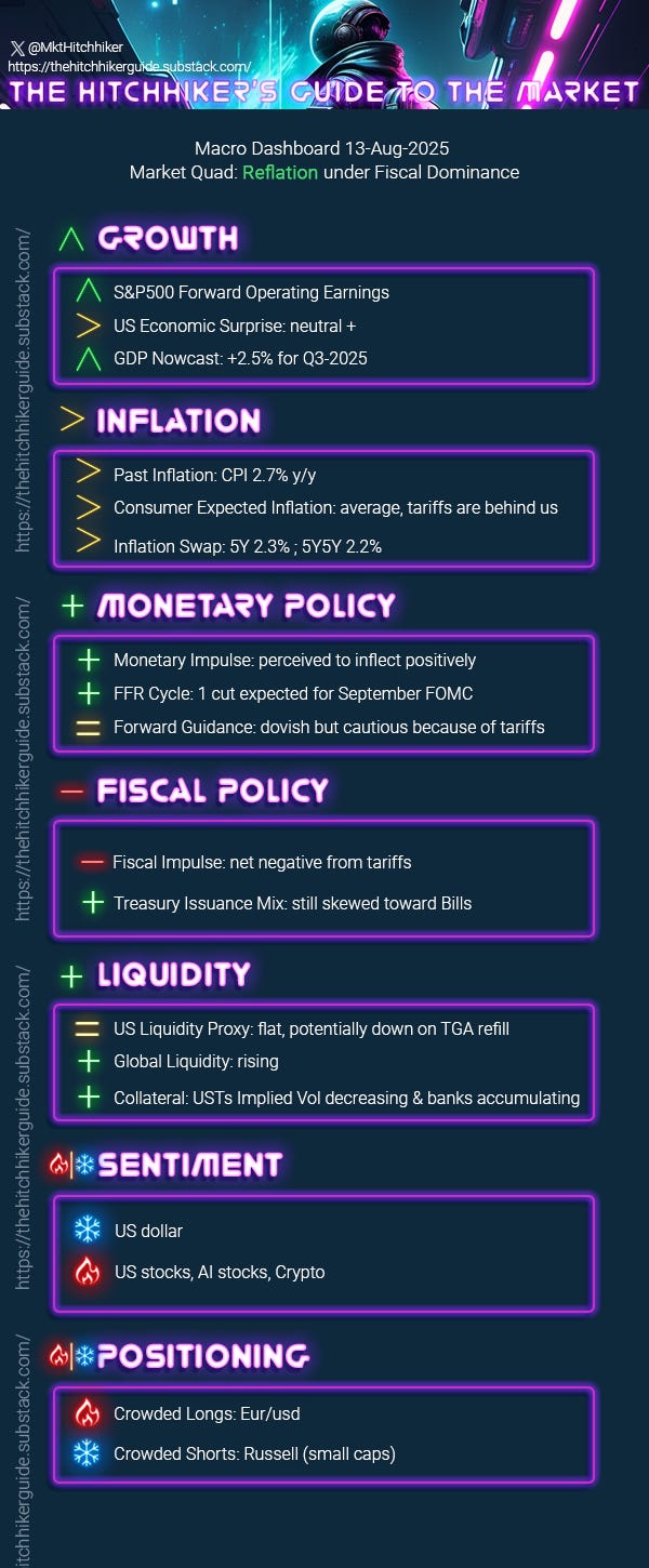 → No update for the inflation category. We remain in a somewhat disinflationary environment driven by lower housing, oil, and wage pressures. However, we must closely monitor upcoming reports, as core goods inflation continues to accelerate, fueled by gradual upward pressure from tariffs. Certain items, such as tenants’ and household insurance, car insurance, and medical insurance, are also surging. Even if the market interprets the headline CPI as ‘cool,’ don’t be misled: inflation is still running above target, and the CPI is largely a made up number. The average citizen is experiencing significantly worse inflation, and the only effective hedge is staying long stocks.