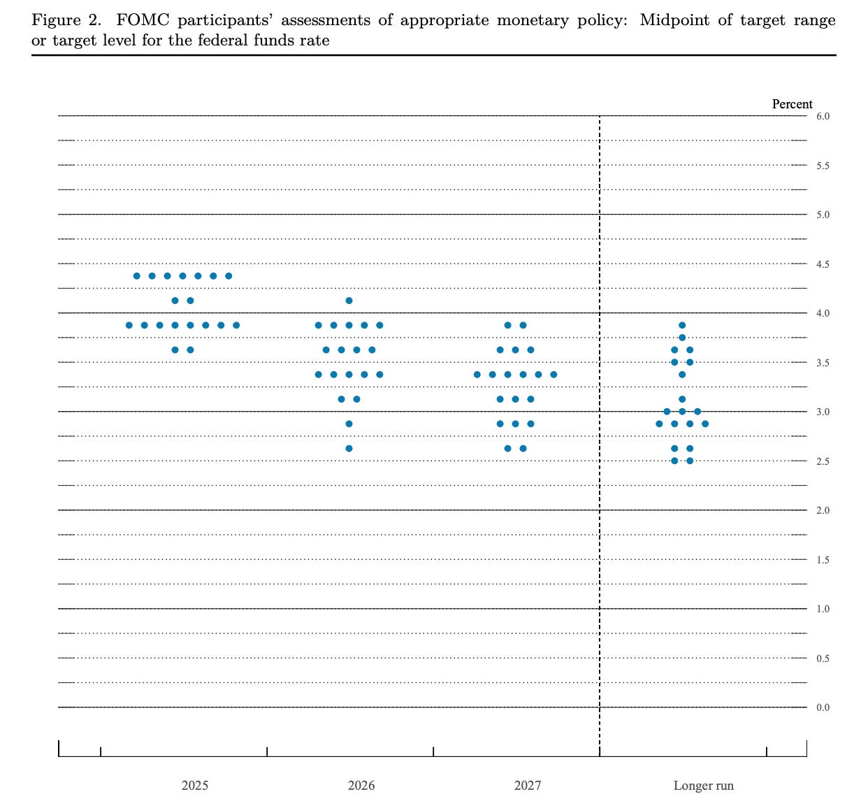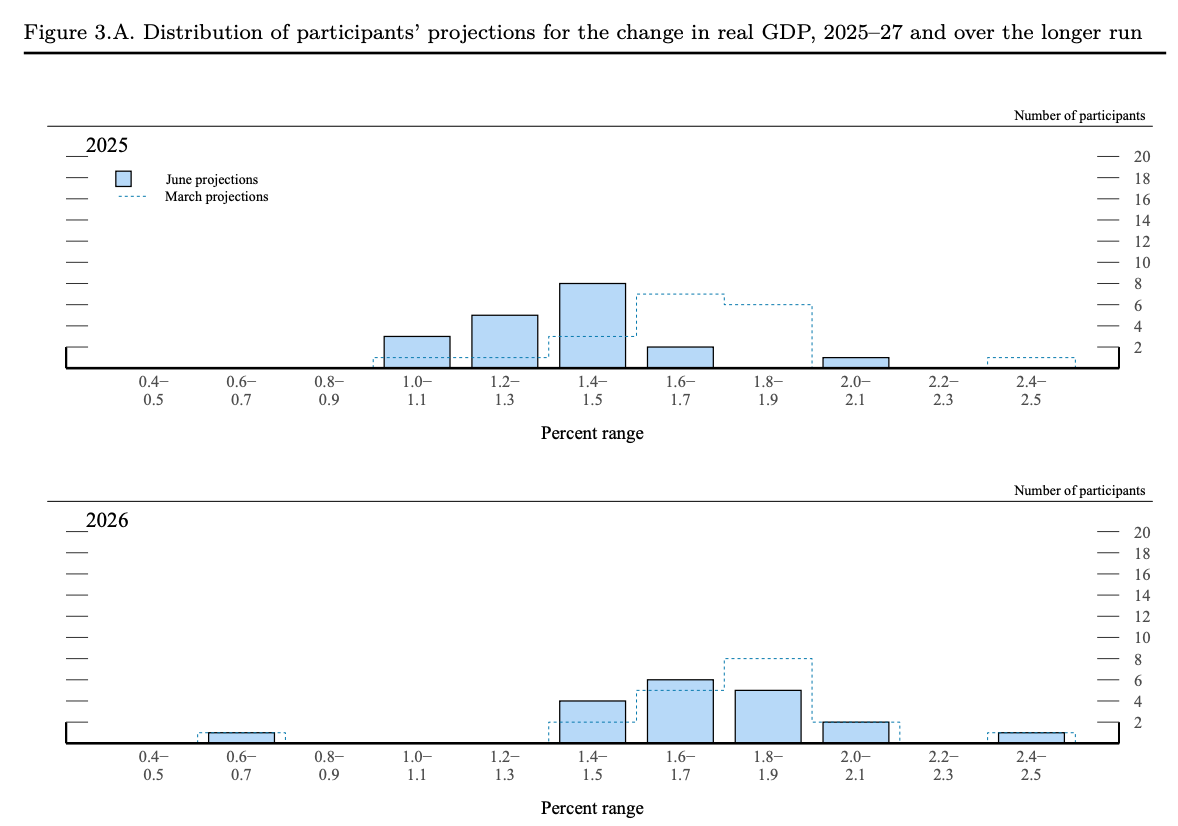It’s interesting to examine the FOMC’s GDP growth outlook. They have downgraded their GDP target for 2025. Kalshi is pricing 1.6% growth for 2025, but FOMC members appear notably bearish, with most projecting below 1.6%.