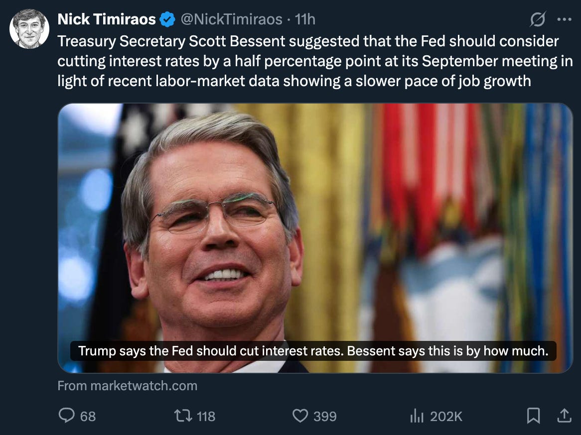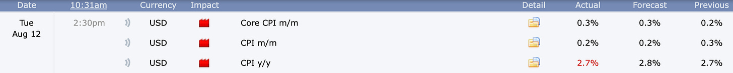 CPI: CPI met expectations. The market rallied strongly on the news, driven by rate-sensitive assets. We even saw Scott Bessent suggest not one but two rate cuts in September!