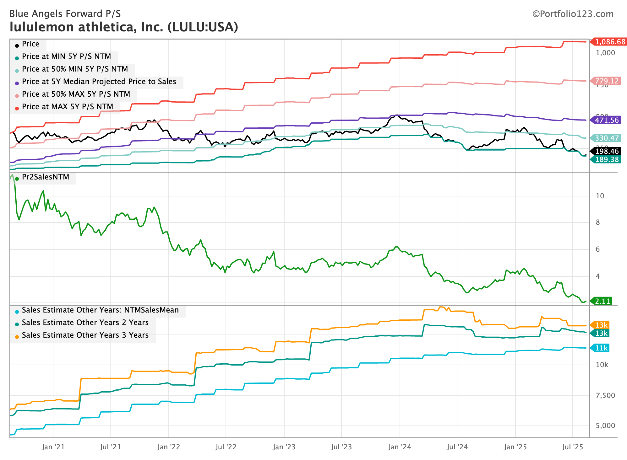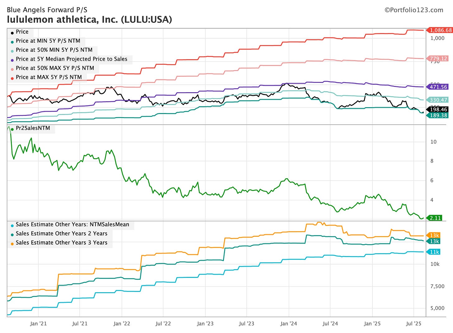 I’ve never bought the dip on Lululemon, and it looks like a classic value trap. The stock is at its lowest forward P/S ratio over the past five years, and forward sales are trending downward. Unlike a stock in a strong uptrend with fundamental tailwinds where you can confidently buy the dip, something more troubling is happening with Lululemon.