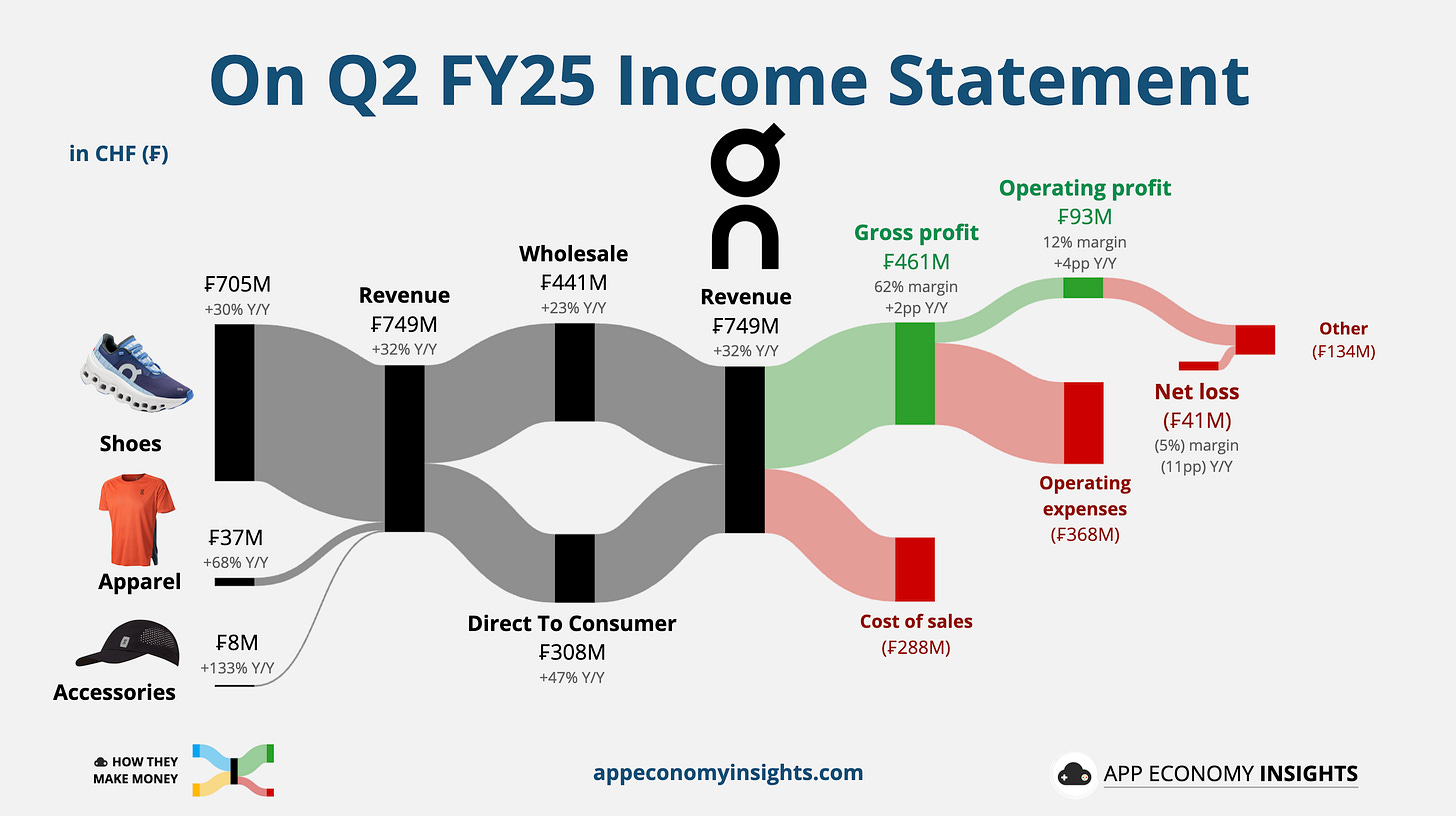 On’s Q2 revenue surged 32% Y/Y to CHF 749 million (US$0.9 billion), with Direct-To-Consumer up 47% to CHF 308 million (now 41% of sales) and wholesale up 23% to CHF 441 million. Gross margin improved by 160 bps to 62%. Adjusted EBITDA hit CHF 136 million (+50%), or 18% margin. On had a surprise net loss of CHF 41 million, driven by FX headwinds from a stronger Swiss franc.
